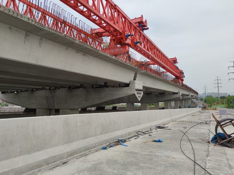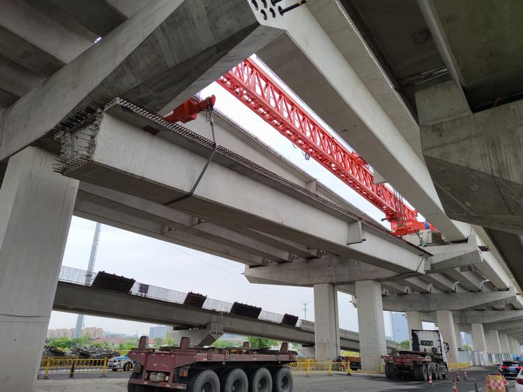 在五一節(jié)期間,項目管理人員和一線工人堅守崗位,鉚足干勁保進度的同時,緊盯安全管理不放松,順利完成所有剩余小箱梁的吊裝。由于兩側(cè)3#、4#匝道小箱梁已于主線段預(yù)先吊裝完成,導(dǎo)致主線部分箱梁采用汽車吊吊裝空間不足,故本次吊裝剩余的小箱梁采用的是180噸、50m跨度的架橋機進行吊裝,同時考慮到5月3日下午節(jié)日返程車流高峰的車輛通行安全,項目部積極與交警部門溝通,優(yōu)化吊裝時間及箱梁吊裝順序,在返程高峰前順利完成吊裝。