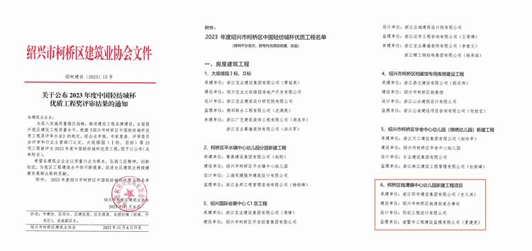 11月6日,紹興市柯橋區(qū)建筑業(yè)協(xié)會公布了“關(guān)于公布2023年度中國輕紡城杯優(yōu)質(zhì)工程獎評審結(jié)果的通知”。由我司承建的柯橋區(qū)錢清鎮(zhèn)中心幼兒園新建工程項目榮獲“2023年度紹興市柯橋區(qū)中國輕紡城杯優(yōu)質(zhì)工程”。