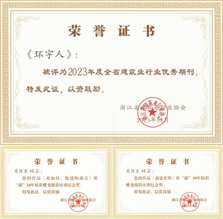 2023年12月6日至7日,2023年度浙江省建筑業(yè)企業(yè)文化交流暨通聯(lián)工作會(huì)議在浙江義烏召開(kāi)。會(huì)議表彰了多項(xiàng)獎(jiǎng)項(xiàng),我司一舉斬獲三項(xiàng)殊榮:《環(huán)宇人》內(nèi)刊榮獲2023年度全省建筑業(yè)行業(yè)優(yōu)秀期刊。環(huán)宇集團(tuán)總經(jīng)理助理兼辦公室主任吳佳寶的攝影作品《夜如晝,搶建隔離點(diǎn)》、《前途光明》獲“浙”20年精彩蝶變攝影比賽紀(jì)念獎(jiǎng)。